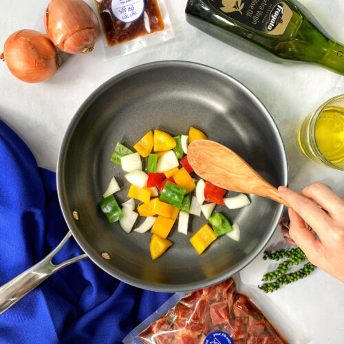 Cho 1 muỗng canh dầu ăn vào chảo, dầu nóng thì cho 1/2 phần hành tỏi băm vào phi cho thơm. Tiếp tục cho hết phần rau củ đã được sơ chế sẵn lên chảo. Nêm nếm nếu cần thiết. Khi thấy hành tây chuyển sang màu, cho vào 1/2 muỗng cà phê đường đảo đều vài lần rồi cho ra dĩa.