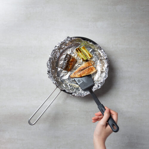 Cover the frying pan with aluminium foil. Oil the surface of the pan lightly. Heat the pan on medium heat. Place the fish skin side down, cook 4-5 minutes on each side until browned and cooked through. At the same time, fry the leeks until soft and translucent.
