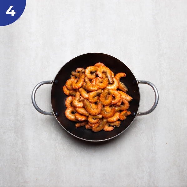 Bắt đầu rang tôm trên chảo nóng với lửa lớn. Không sử dụng dầu trong lúc rang để tôm được khô ráo. Rang đến khi tôm chuyển màu hồng đỏ, săn lại và muối bám vào vỏ tôm. Tắt bếp và dùng ngay khi tôm còn nóng.